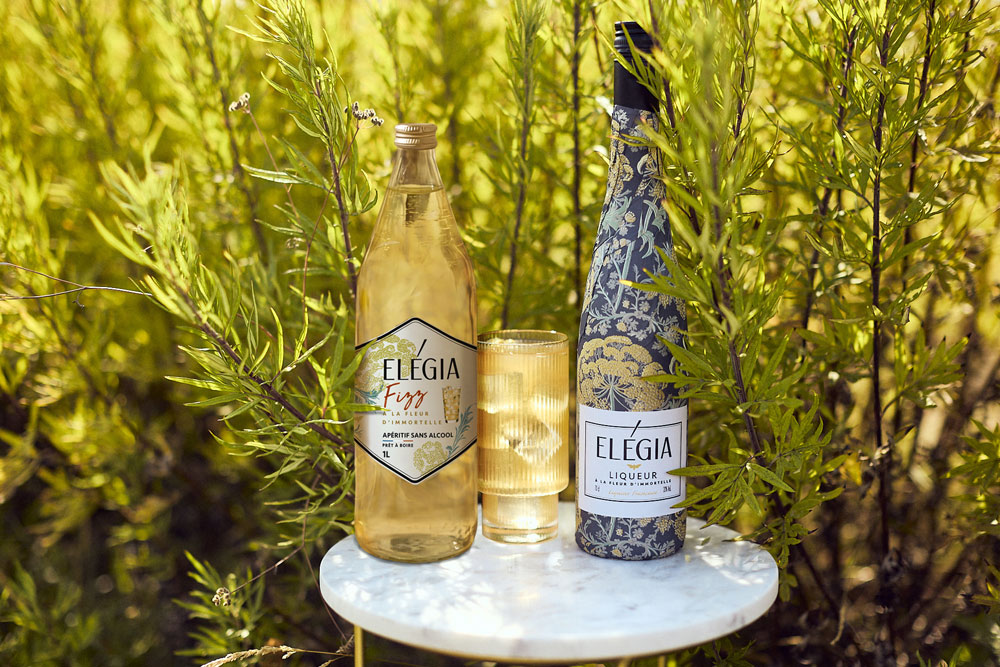 Cette vision se traduit par des boissons pensées pour transporter, à travers les notes solaires de la fleur d’immortelle, la richesse des plantes qui composent nos recettes, et l’évocation d’un paysage qui nous est cher.